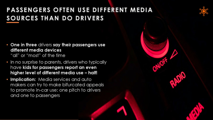 事实上,只有不到一半的受访者表示他们总是或大部分时间在车里收听流媒体音乐/音频订阅(31%),对卫星广播(30%)、个人音乐下载(28 %)和免费流媒体音乐/音频(26%)的收听情况类似。