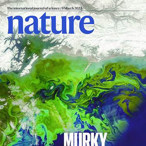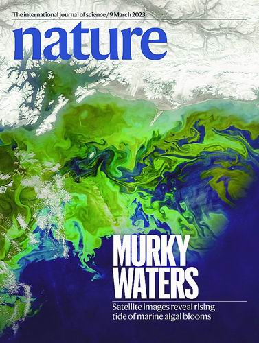 一幅海岸带藻华卫星图,右下角写着“MURKY WATERS”(浑浊的海水),这是今年3月9日的《自然》杂志封面。