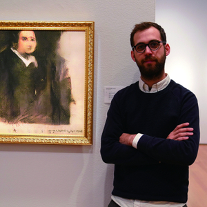 图为AI创作的一幅绘画《埃德蒙·贝拉米肖像》及其创作机构Obvious联合创始人皮埃尔·福特雷。