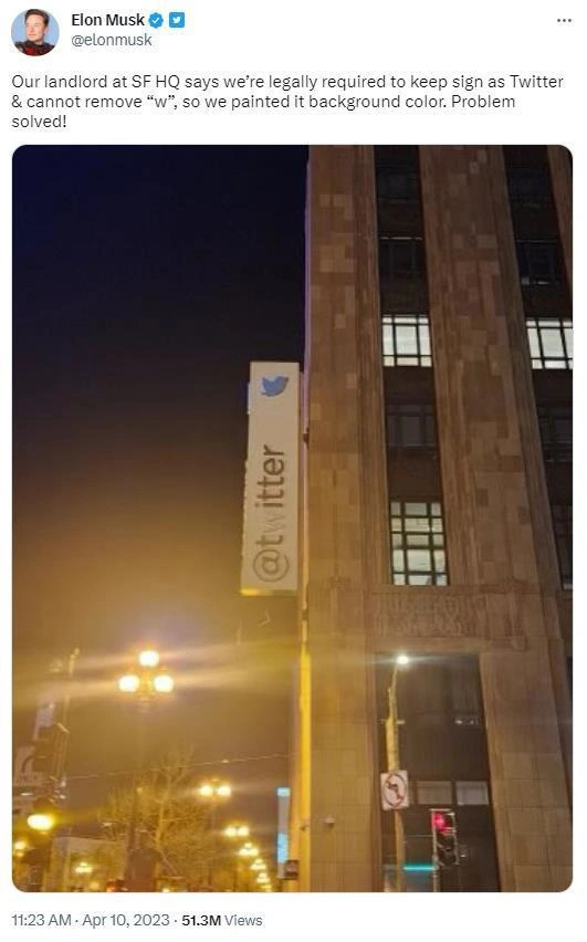 那么为何要这么做?马斯克推文做出了解释:称由于法律规定公司不得随意修改招牌上的单词,因此他建议把字母“w”涂成与背景板相同的颜色,使得招牌乍一看像是“Titter”,以达到“改名”的效果。