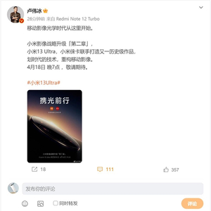 快科技4月12日消息,小米集团卢伟冰为小米13 Ultra预热,称小米13 Ultra是小米徕卡联手打造的又一历史级作品,4月18日正式发布。