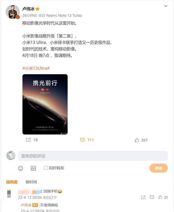 网友发现,卢伟冰发这条微博使用的手机仍然是Redmi Note 12 Turbo,而不是小米13 Ultra。对此,卢伟冰表示“不舍得Redmi Note 12 Turbo”。