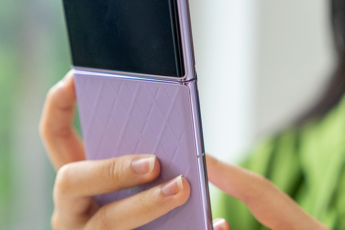 我们这次拿到的是菱紫配色的vivoXFlip,也是目前的流行色之一,这种低饱和度的紫色接近于莫兰迪色系,让手机更加耐看,也很容易与女生不同的衣服、饰物想搭配,不会抢去服饰的「风头」,vivo果然很懂女生。