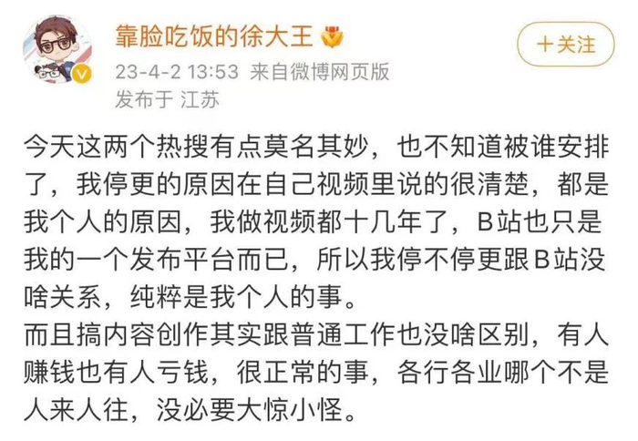 @靠脸吃饭的徐大王 发微博表示做视频不赚钱甚至亏钱,全靠在早期吃到平台发展的红利支撑。@-lks- 也表示,停更主要是想要休息。他透露:目前整个团队处于亏损状态,无法养活一个团队,另一方面目前创作也遇到一些发展瓶颈。