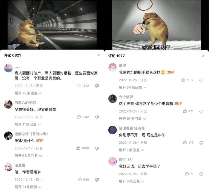 而有时在它不羁的外表下也创作出令人感动的作品。在这个由@酸辣土豆丝 创作的Cheems剧场中,一条怀念女朋友的视频引发了上万条评论。有人说这是“用沙雕的动画阐述最感人的故事”,也有人说这个故事让他想到了自己的经历。