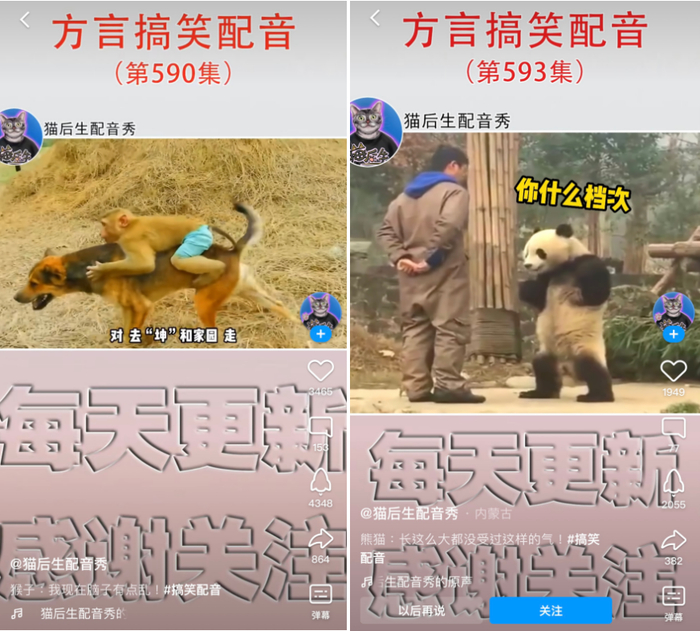 而用户@猫后生配音秀 则用生动有趣的方言为动物配音。一段平平无奇的“狗背猴子走路”,却在配音的润色下摇身一变成了“猴子打滴滴狗车去给公鸡看病”的搞怪剧情。而另一个熊猫与饲养员转圈圈的无声视频,被加上了你来我往的拌嘴配音后,熊猫和饲养员的人设就一下子立住了。尤其是熊猫的一句“你什么档次”,视频秒变《狂飙》拍摄现场,看着就像高启强和徐江在斗嘴。