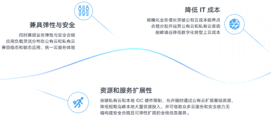 混合云 2.0 在 1.0 的基础之上集成同构的全栈私有云能力,涵盖虚拟化、SDN 网络、裸金属、分布式存储、数据库缓存、大数据平台及统一云管平台等服务能力,实现统一运营运维管理,统一安全服务保障,并与公有云内网互通,可随时进行业务和数据的云上云下互通迁移。