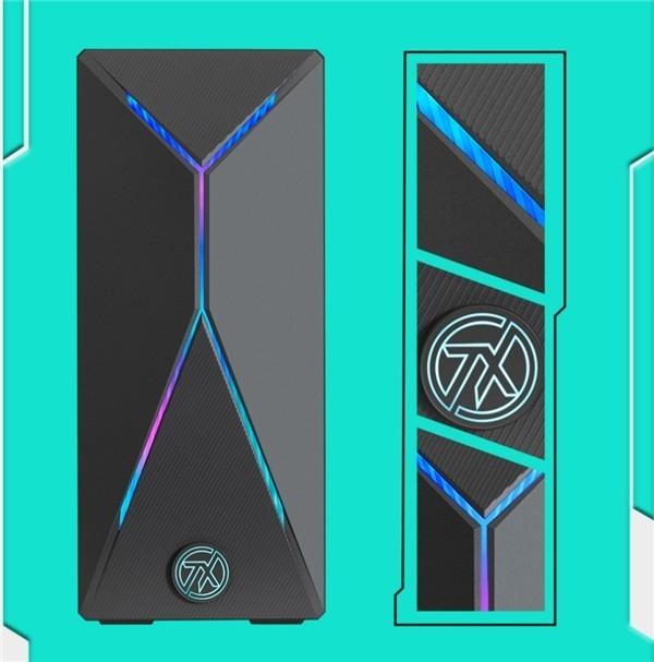 华硕天选X2023高性能台式机的外观相较于上一代有了全新的升级,机身正面多线条设计,使外观造型的棱角感分明,同时增加了灯带,跨次元气质进一步凸显。整体外观造型极具几何感,机身正面是新潮的3D三角形图案设计并搭配抽象化纹理,机身底部设计了天选“TX”缩写的圆形盾徽,开机时会亮起蓝色的灯效,使外观颜值直线上升。