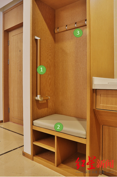 进入房间,家具边缘的圆角、安全的厨房设施、洗手间的防滑倒设施,以及床头和沙发等多点位超过2400多个拉绳的呼叫系统,让老人即便是单独居住也能放心。