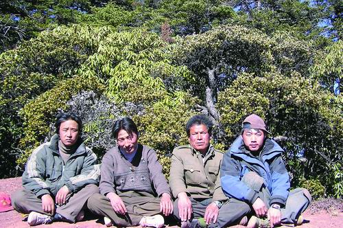 2003年,向左甫(右一)和邓批(右二)以及藏语翻译兼向导次仁(左一)等紧挨着席地而坐。