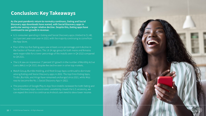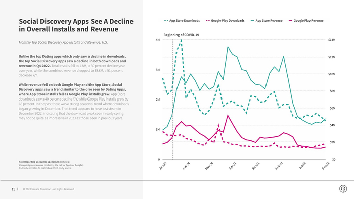 2022年第四季度,约会和社交发现应用的安装量为1890万次,同比下降11%。年度安装量为7730万,同比下降7%。