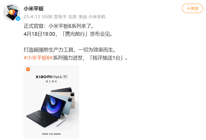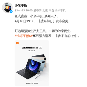 今日,小米平板官方微博发文官宣,小米 Pad 6 系列平板电脑也将亮相 4 月 18 日晚 7 点的小米“携光同行”新品发布会,官方宣称其为“打造超强势生产力工具,一切为效率而生”。