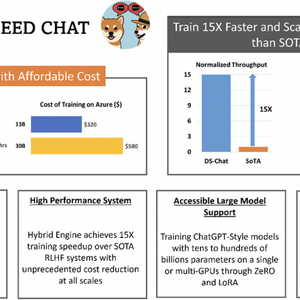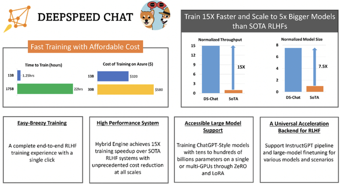 3. 高效性和经济性:可将训练速度提升15倍以上,并大幅度降低成本。例如,DeepSpeed-HE若在Azure云上训练一个OPT-30B模型,仅需18小时、花费不到300美元。