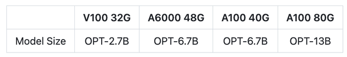 表 3. DeepSpeed-HE 在不同的 GPU 单卡上支持的最大模型。