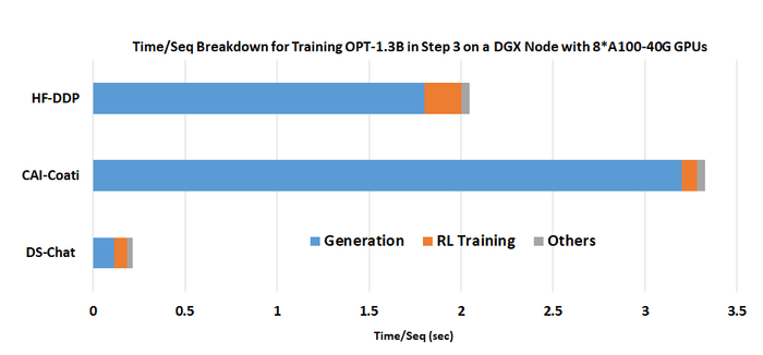 图 5. DeepSpeed Chat 的混合引擎在生成阶段的优越加速:在单个 DGX 节点上使用 8 个 A100-40G GPU 训练 OPT-1.3B actor 模型 + OPT-350M reward 模型的时间 / 序列分解