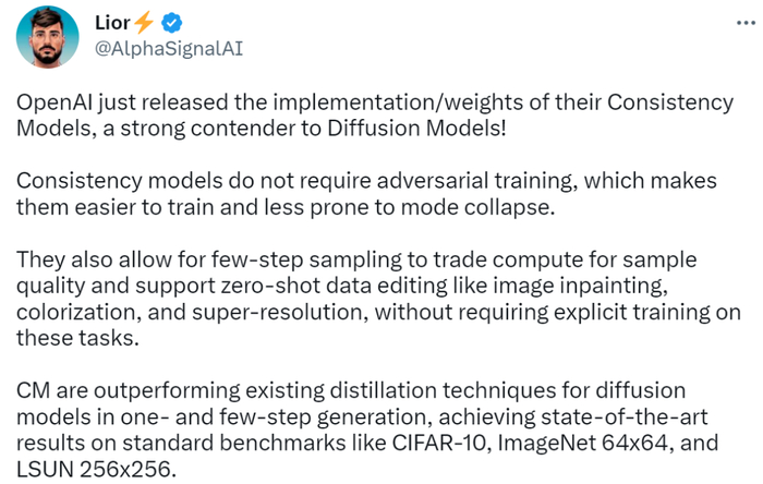 有网友将其视为扩散模型的有力竞争者!并表示 Consistency Models 无需对抗性训练,这使得它们更容易训练,不容易出现模式崩溃。