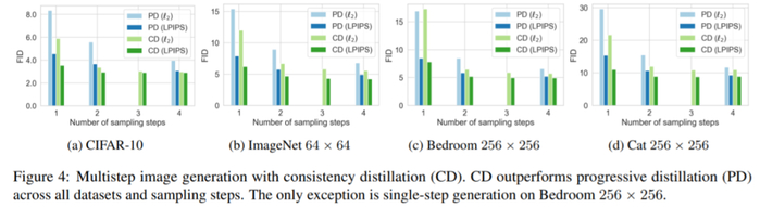 研究团队通过实验证明 Consistency Models 在 one-step 和 few-step 生成中优于现有的扩散模型蒸馏方法。例如,在 one-step 生成方面,Consistency Models 在 CIFAR-10 上实现了新的 SOTA FID 3.55,在 ImageNet 64 x 64 上为 6.20。当作为独立生成模型进行训练时,Consistency Models 在 CIFAR-10、ImageNet 64 x 64 和 LSUN 256 x 256 等标准基准上的表现也优于 single-step、非对抗生成模型。