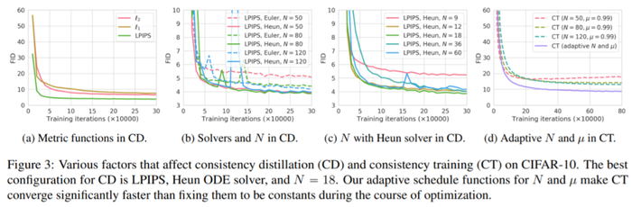 值得注意的是,这两种训练方法都不需要对抗训练,并且都允许 Consistency Models 灵活采用神经网络架构。