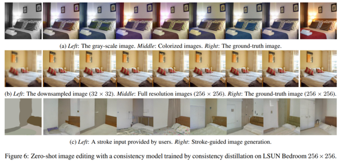 图 6a 展示了 Consistency Model 可以在测试时对灰度卧室图像进行着色,即使它从未接受过着色任务的训练,可以看出,Consistency Model 的着色效果非常自然,很逼真;图 6b 展示了 Consistency Model 可以从低分辨率输入生成高分辨率图像,Consistency Model 将 32x32 分辨率图像转成 256x256 高分辨率图像,和真值图像(最右边)看起来没什么区别。图 6c 证明了 Consistency Model 可以根据人类要求生成图像(生成了有床和柜子的卧室)。