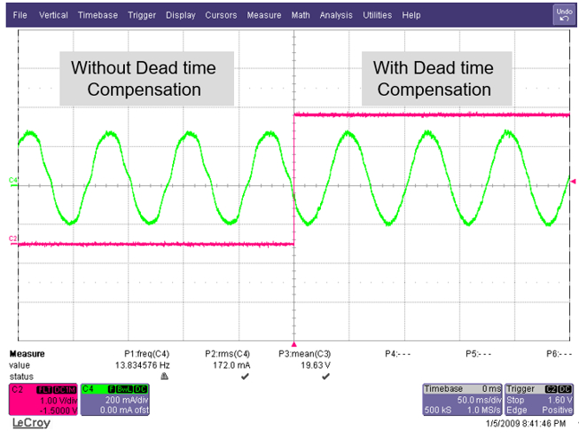 要管理这种额外的噪声,工程师可以利用谐振控制器集成死区时间补偿,以便控制相电流中的谐波分量,从而缓解因死区时间导致的电流失真,如图 5 所示。