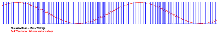 用于降低电机控制应用中可闻噪声的第一种策略是连续 PWM。PWM 是一种技术,通过导通和关断晶体管来产生输出波形,从而让电机电压在给定时间处于高电压或低电压状态。然后,电机中的电感对这些波形进行滤波,以便基本上平均输出波形。调整占空比(波形导通时间与关断时间之比)将改变平均电压。图 2 展示了使用 PWM 生成正弦波的一个示例。