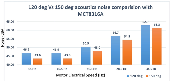 为了应对这些挑战并提高声学性能,工程师可以构建能够在 120 度梯形换向和 150 度梯形换向之间动态切换的电机驱动器系统。这种动态调制可以改善 BLDC 电机控制期间的整体声学性能。
