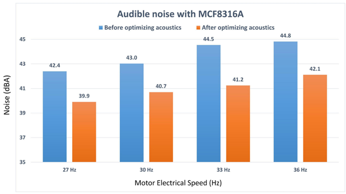例如,TI 的 MCF8316A BLDC 集成控制栅极驱动器(一款无传感器 FOC 电机驱动器)采用此内置功能来优化多种电机频率下的声学性能,如图 6 所示。