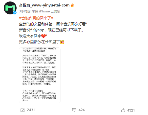 音悦台官方今日回应称,之所以选择“冬眠”,根本原因是音悦台丢失了初心,并在战略战术上出现了众多失误,迫于无奈才选择了短暂离开。