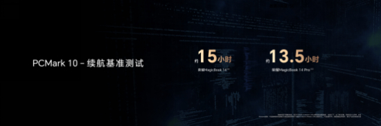 荣耀MagicBook 14系列2023全系配备了一块75Wh的超大容量电池,加上荣耀自研的OS Turbo 2.0技术调校,在 PCMark10的续航基准测试下,新一代荣耀MagicBook 14和14 Pro综合续航时长可达到15小时和13.5小时,足以满足一整天工作需求。与友商相同电池容量产品对比,本地视频播放和网页浏览分别最高多2.4小时和1.5小时,为中国14寸轻薄本的续航天花板。