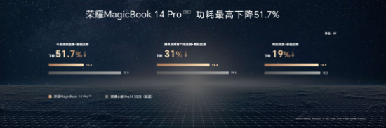 在OS Turbo 2.0技术加持下,荣耀MagicBook 14系列2023在单一场景下可达到30%-50%续航提升,全场景下达到10%-30%的续航提升。与友商相同配置产品对比,在后台运行基础应用时,微信视频聊天、电脑追剧、Office和会议办公的场景下,荣耀MagicBook 14 2023功耗最高下降37.1%,荣耀MagicBook 14 Pro 2023功耗最高下降51.7%。