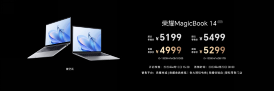 2023年4月13日15:30,荣耀MagicBook 14系列2023将在荣耀商城、荣耀亲选商城、各大授权电商、荣耀体验店、授权零售门店开启预售;4月20日00:00开启首销。