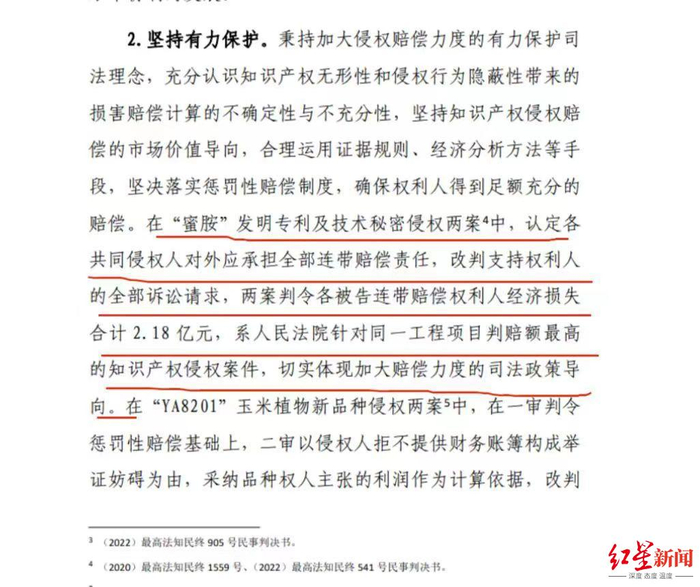 最高法表示,两案判令各被告连带赔偿权利人经济损失合计2.18亿元,系人民法院针对同一工程项目判赔额最高的知识产权侵权案件,判决不仅彰显人民法院切实加强知识产权司法保护的坚定态度,也充分体现对内资和外资企业、国有和民营企业等各类企业的一体对待、平等保护。