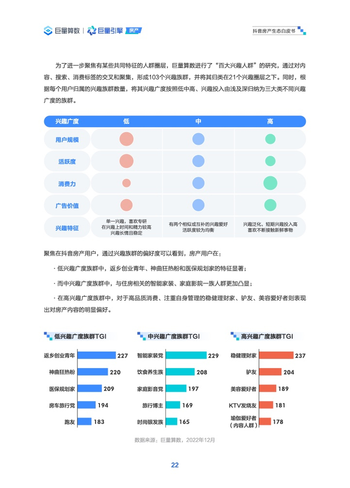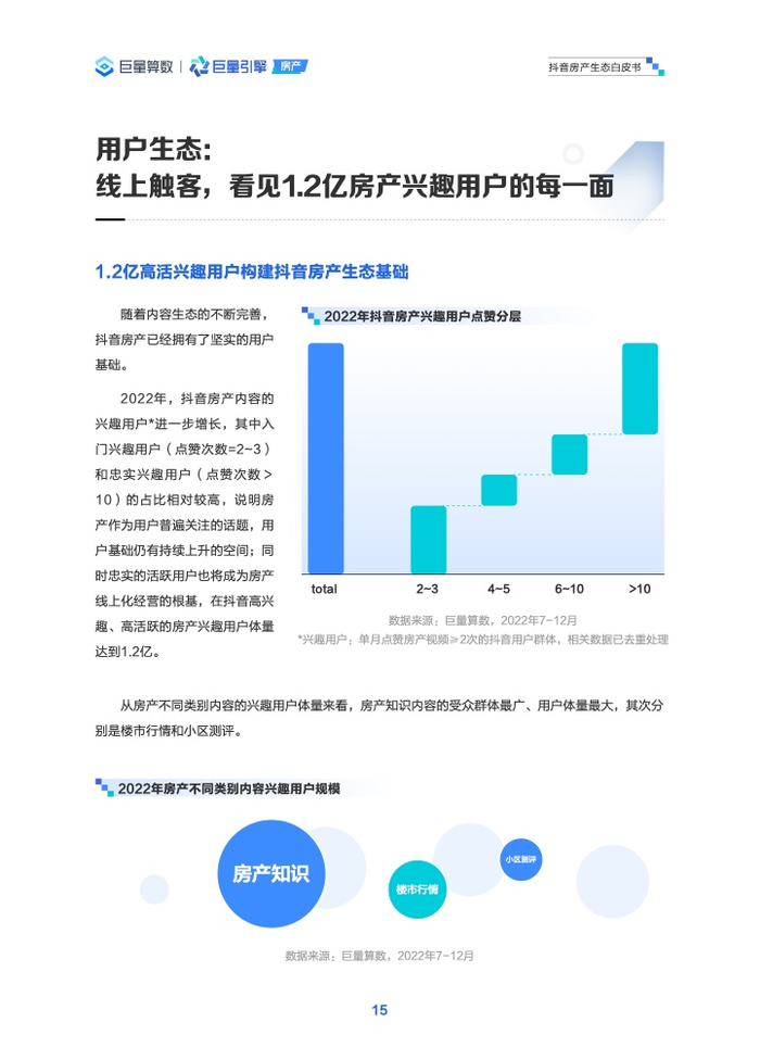2022年,抖音房产内容的互动量超过200亿次,包括点赞、评论、转发的互动行为同比2021年都实现了稳定增长,用户对房产内容的需求持续推动着内容生态丰富完善,高活跃兴趣用户体量达到1.2亿。