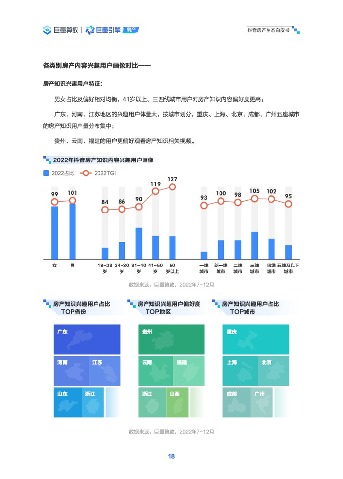 房产知识的兴趣用户特征:男女均衡,41岁以上、三四线城市,典型城市有贵州、云南、福建;