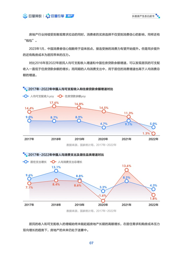 2016年,“房住不炒”首次在政府工作报告中被提出,奠定了未来对楼市调控的主基调。房地产政策频繁调控的几年时间,加之黑天鹅事件波及,房地产交易量和交易额增速开始大幅下降、消费者购房信心迅速下落。但与此同时发生变化的还有:住宅属性的房屋消费成为主导房产发展推动力、连降23个月的国房景气指数开始回温…