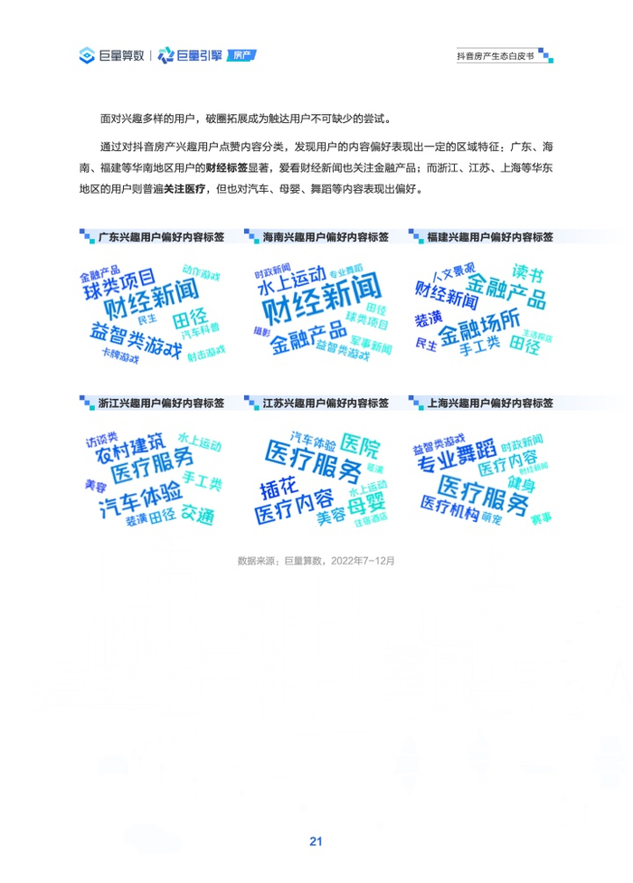 面对兴趣多样的用户,破圈拓展成为触达用户不可缺少的尝试。抖音房产兴趣用户的内容偏好表现出一定的区域特征:广东、海南、福建等华南地区用户的财经标签显著;而浙江、江苏、上海等华东地区的用户则普遍关注医疗。