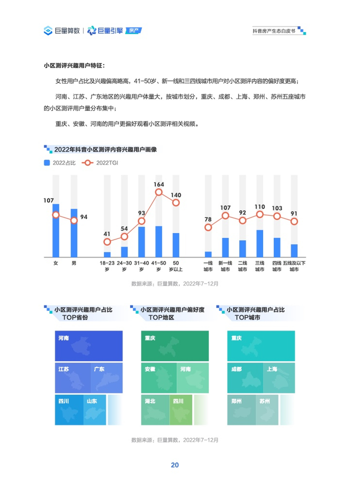 小区测评的兴趣用户特征:女性,41-50岁、新一线和三四线城市,典型城市有重庆、安徽、河南。