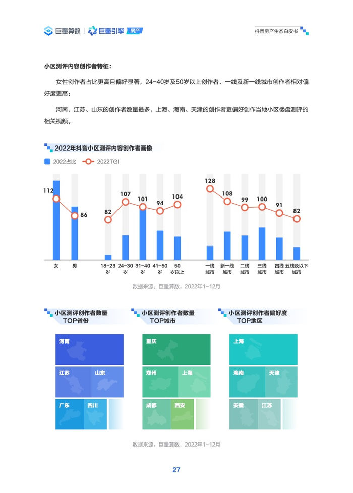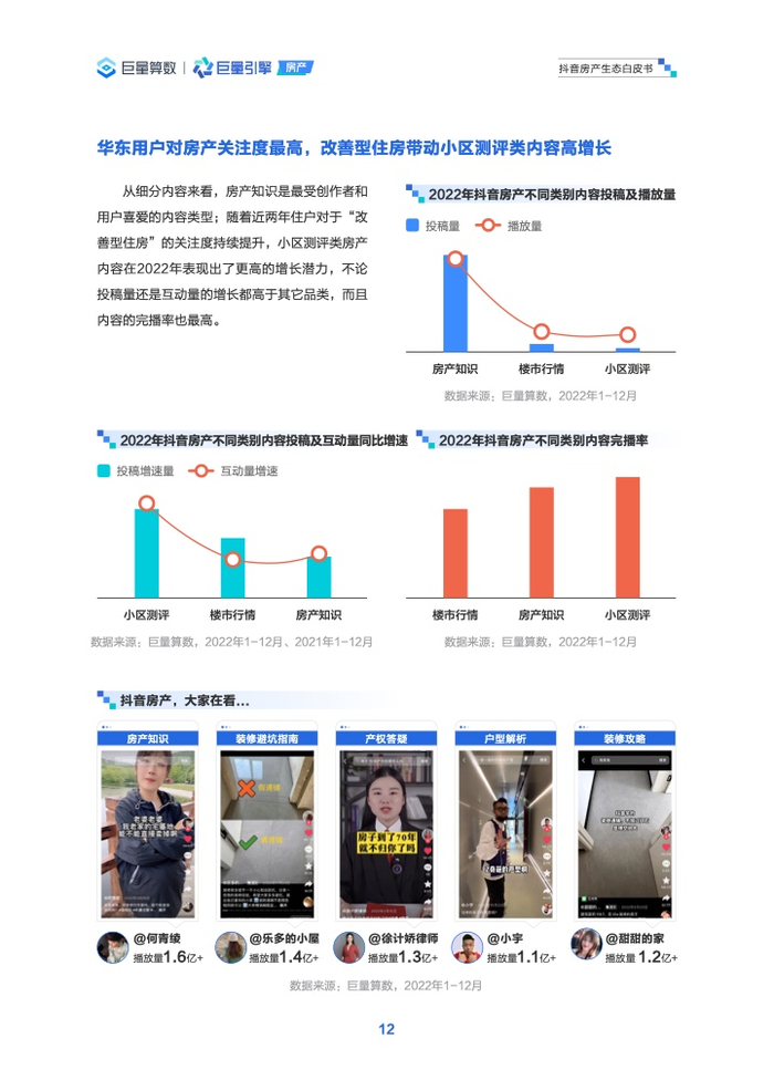 从细分内容来看,房产知识最受创作者和用户喜爱,但近两年随着“改善型住房”被高度关注,小区测评类的房产内容收获了更高的关注,因此带动了更多创作小区测评相关内容的创作者涌现。