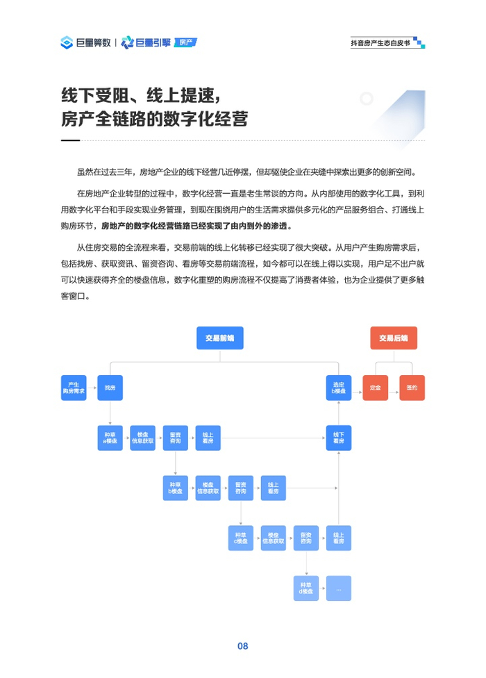 随着房地产的数字化经营链路已经实现由内到外的渗透,住房交易流程的数字化重塑不仅提高了消费者体验,也为企业提供了更多触客窗口。