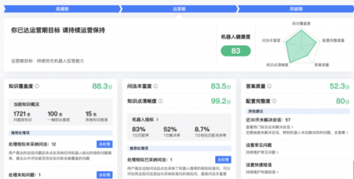 在后续回访中选型负责人还提到,在前期测试过程中,七鱼机器人所提供的“机器人诊断看板”让他感到眼前一亮,也是推动双方合作的重要原因之一。“融昕的服务智能化能力处于比较初期的阶段,这个看板能够清晰地告诉我们的后台操作人员,机器人目前处于什么水平,根据当前的配置有哪些相应的建议,辅助我们一步步完善。”