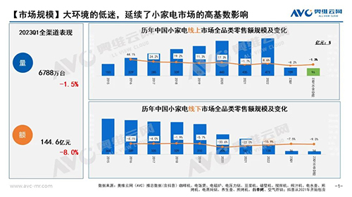 “慌慌张张,匆匆忙忙”的第一季度悄然落幕,厨房小家电的成绩单也如约而至,据奥维云网(AVC)全渠道推总数据显示厨房小家电(咖啡机、电饭煲、电磁炉、电压力锅、豆浆机、破壁机、搅拌机、榨汁机、电水壶、煎烤机、电蒸炖锅、养生壶、煎烤机、台单烤、空气炸锅)零售额144.6亿元同比下降8.0%;零售量6788万台,同比下降1.5%。其中线上渠道零售额109亿元,同比下降8.2%,线下零售额36亿元,同比下降7.5%。
