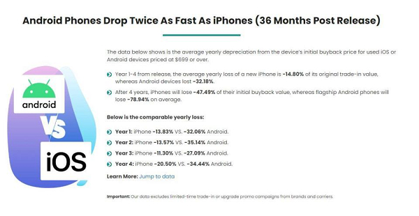 近期,由BankMyCell发布的一则调查报告显示,安卓手机和iPhone的折旧率存在显著差异,iPhone折旧率要低上很多。