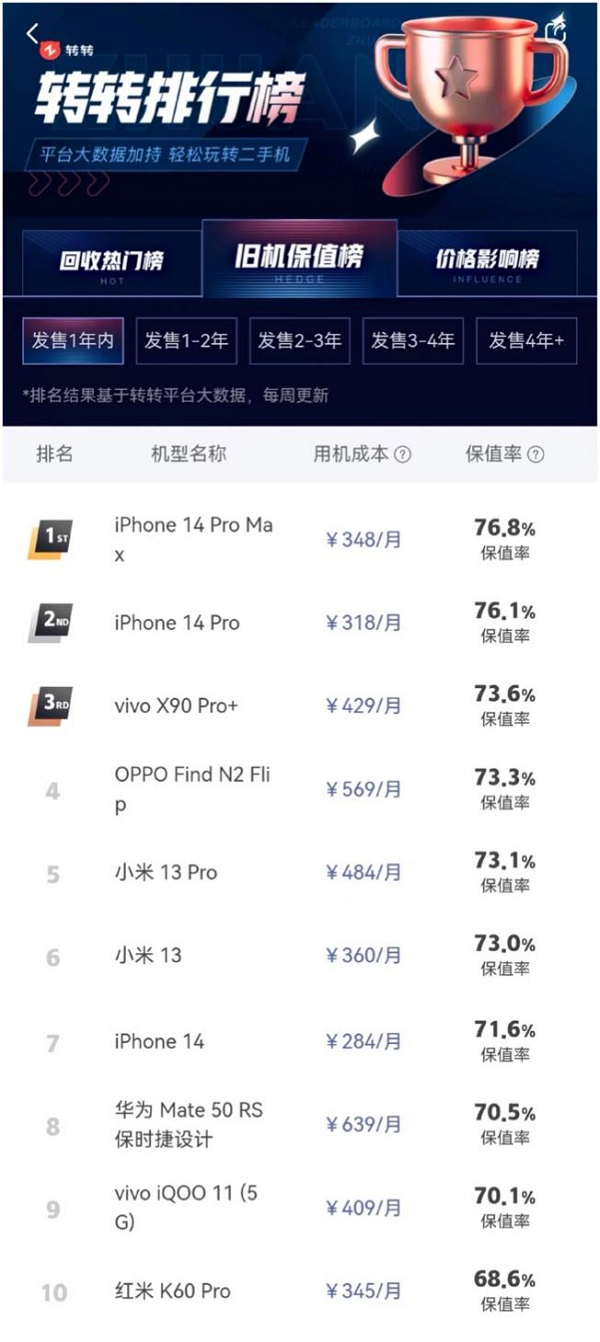 二手iPhone14 Pro Max保值率第一,上转转出手旧机更划算