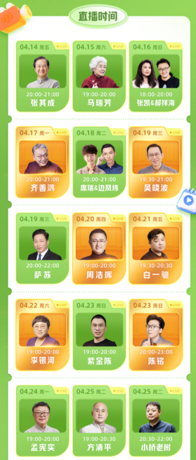 4月14日至27日期间,喜马拉雅将邀请一众大咖,包括齐善鸿、张其成、马瑞芳、李银河、紫金陈、白一骢、周浩晖、金灿荣、吴晓波、席瑞、方清平、韩占军和小桥老树等每天为听众带来不同主题的精彩讲书直播。在17场直播中,20余位大咖将分享书籍、讲解书籍,并为听众分享更多书籍背后的创作故事。听众将有机会与自己喜欢的作家近距离互动,一起享受读书的美好。
