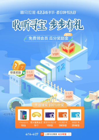 喜马拉雅423听书节为用户准备了丰富的活动福利。用户参与423寻宝活动,每完成一个任务即可获得步数奖励,每走1步至少得0.5天VIP会员,更有惊喜好礼加赠。进入喜马拉雅app,搜索【423寻宝】即可参与,VIP会员多听多送。