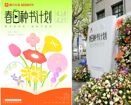 423听书节期间,喜马拉雅将携手茶饮品牌茶百道、书店方所和公益机构春晖博爱公益基金会共同开启“春日种书计划”品牌活动。即日起,听书爱好者就可前往上海(衡山·和集)、青岛、成都、广州、合肥(长江·和集)的方所书店线下参与活动,领取限量周边;同时也可在线上进入喜马拉雅X方所听书专场,领取春日治愈书七天免费听礼包,邀请朋友一同种下好书。限时好书包括《乞力马扎罗山的雪》、《长日将近》、《我心归处是敦煌》等。上海、青岛、成都还有书中鲜花瀑布艺术互动装置供读者拍照打卡。