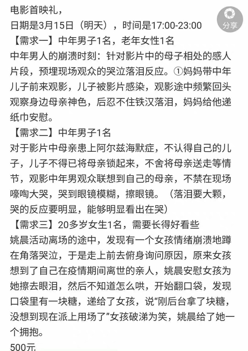 不久前,由姚晨夫妇监制的电影《脐带》,被曝在首映礼上招群演来“加戏”,费用500元。根据网络流传的截图来看,群演要求中,设计出的剧情人设丰满——有中年男人的崩溃时刻,还有眼泪大颗的细致要求,琼瑶阿姨看了都要赞一声审美。
