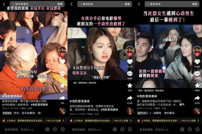 借着电影荧幕的光,大颗的眼泪从女孩的眼里落下,她略显慌乱地找着纸巾,显然被电影情节打动。而短视频的配字,则是近期将要上映的某部电影。