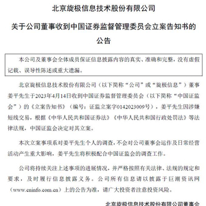中新经纬4月14日电 旋极信息14日公告,公司董事姜平因涉嫌短线交易,收到证监会立案告知书。