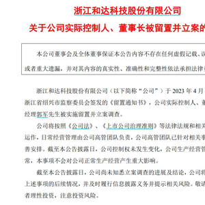 中新经纬4月14日电 14日晚间,和达科技公告称,4月13日收到浙江省绍兴市监察委员会签发的《留置通知书》,公司实际控制人、董事长、总经理郭军被实施留置并立案调查。